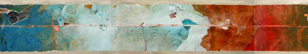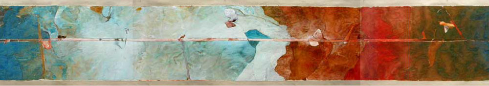 Original painting (only a section of it in the banner above) was executed on the back of a roll of circa 1950's wallpaper. The image is 18 inches high and 40 feet long and is done in Watercolor and Watercolor Gouache. It is dry mounted on cloth for purposes of display and preservation.